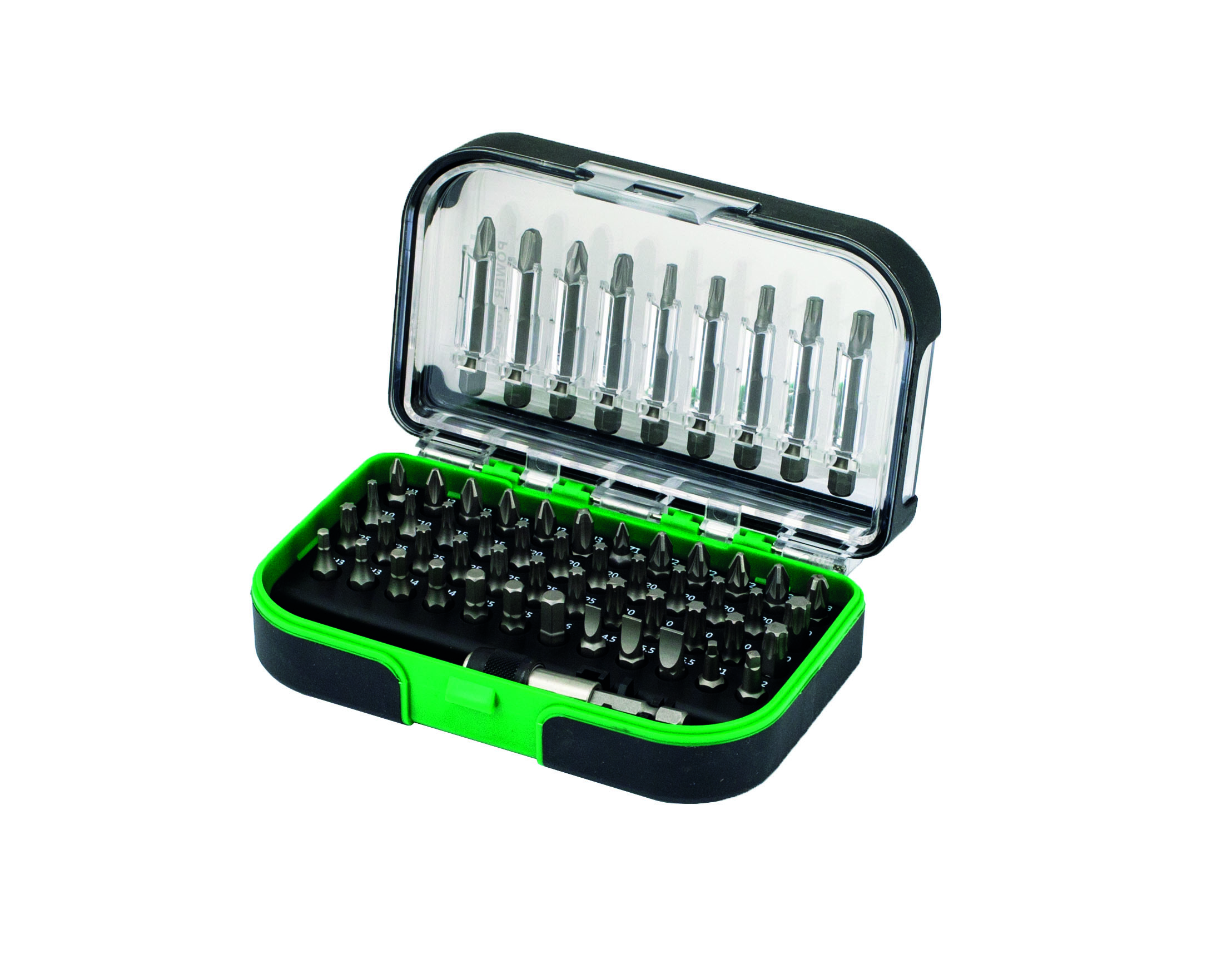 Sisältö: Phillips 50 mm: 2, 3 / Pozidrive 50 mm: 2, 3 / Torx 50 mm: 15, 20 (x2), 25, 30 / Phillips: 1, 2 (x4), 3 / Pozidrive: 1, 2 (x4), 3 / Torx: 10 (x2), 15 (x2), 20 (x7), 25 (x7), 30 (x4), 40 (x2) / Kuusio: 3 (x2), 4 (x2), 5 (x2), 6 / Ura: 4.5, 5.5, 6.5 / Neliö: 1, 2 / Bitsinpidin